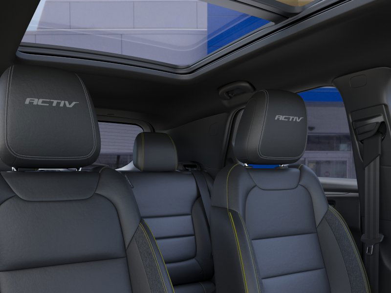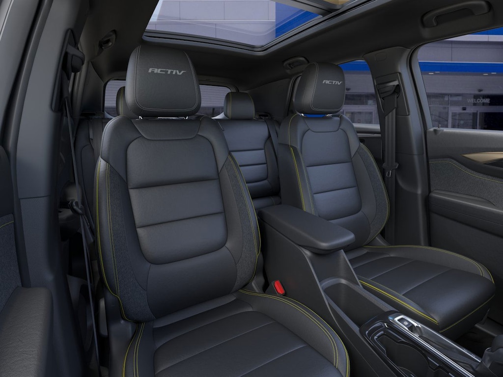SUNROOF, POWER, DUAL-PANE, PANORAMIC, CONVENIENCE PACKAGE includes (C68) automatic climate control air conditioning, (USS) one type-A and one type-C charging only USB ports, (K4C) Wireless Charging, (KI6) 120-volt power outlet, (DD8) inside rearview auto-dimming mirror and (DMS) driver and front passenger illuminated vanity mirrors, covered, sliding visors (Also includes (TC2) hands free power liftgate. DRIVER CONFIDENCE PACKAGE includes (UKC) Lane Change Alert with Side Blind Zone Alert, (UFG) Rear Cross Traffic Alert and (UD7) Rear Park Assist, LPO, ALL-WEATHER FLOOR LINERS, FRONT AND REAR, AUDIO SYSTEM, 11" DIAGONAL HD COLOR TOUCHSCREEN, AM/FM STEREO. Additional features for compatible phones include: Bluetooth® audio streaming for 2 active devices, voice command pass-through to phone, wireless Apple CarPlay® and wireless Android Auto® capable (STD), ENGINE, ECOTEC 1.3L I3 TURBO DOHC SIDI WITH VARIABLE VALVE TIMING (VVT) (155 hp [115 kW] @ 5600 rpm, 174 lb-ft torque [236 N-m] @ 1600 rpm) (STD), TRANSMISSION, 9-SPEED AUTOMATIC (STD). Chevrolet ACTIV with Cacti Green exterior and Jet Black with Yellow stitching interior features a 3 Cylinder Engine with 155 HP at 5600 RPM*.