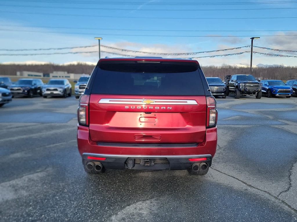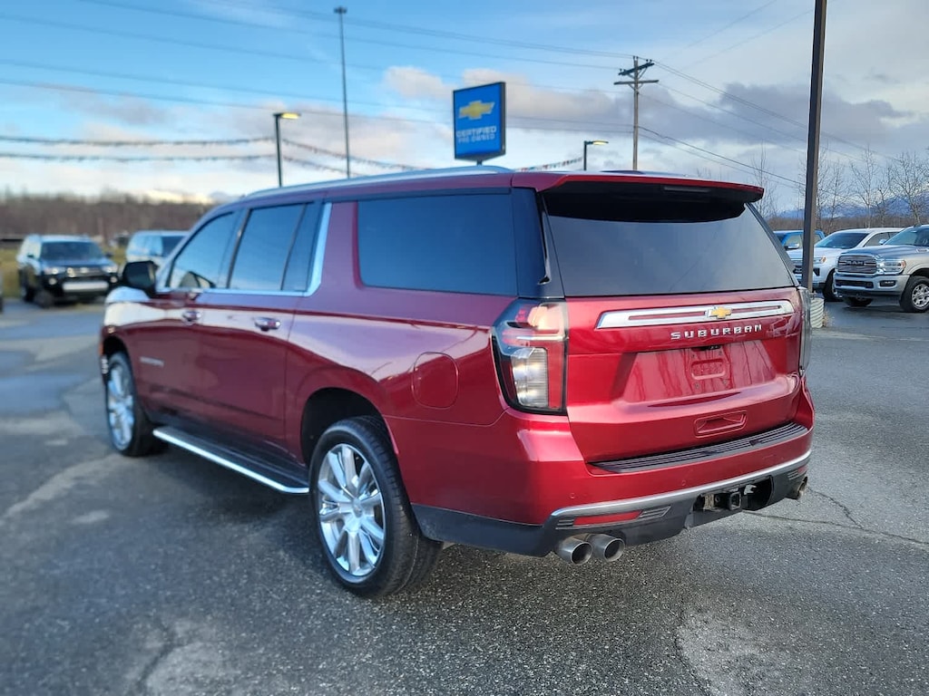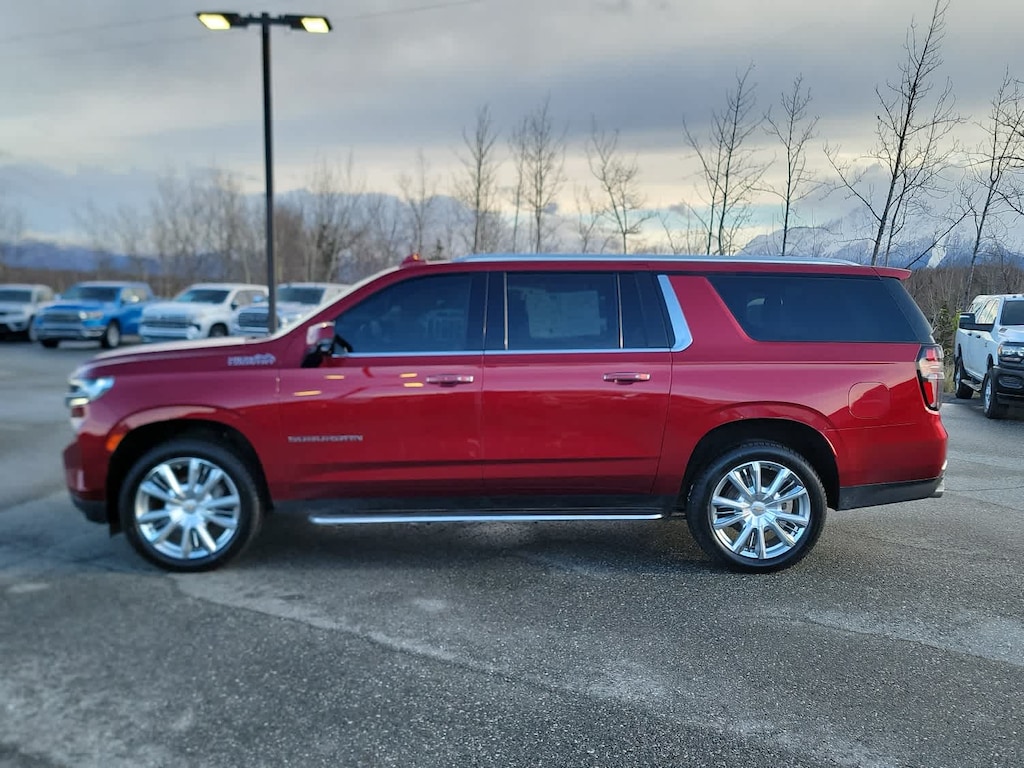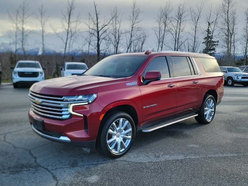 includes dual rear seat-mounted 12.6" diagonal color-touch LCD HD screens, Wi-Fi wireless projection capability, two 2-channel wireless infrared digital headphones with 2 HDMI ports on the back of the center console; compatible with Bluetooth® headphones, AM/FM stereo, Bluetooth® audio streaming for 2 active devices, Apple CarPlay® and Android Auto® capable, enhanced voice recognition, additional memory for in-vehicle apps, cloud connected personalization for select infotainment and vehicle settings. Subscription required for enhanced and connected services after trial period. (STD), with Dynamic Fuel Management, Direct Injection and Variable Valve Timing, includes aluminum block construction (420 hp [313 kW] @ 5600 rpm, 460 lb-ft of torque [624 Nm] @ 4100 rpm) (STD), electronically controlled with overdrive, includes Traction Select System including tow/haul (Most vehicles built on or after 6-7-2021 with a V8 engine will have (NSS) Not Equipped with Automatic Stop/Start, which removes Automatic Stop/Start, Engine control stop/start disable button and its content.) (STD). Chevrolet High Country with Cherry Red Tintcoat exterior and Jet Black/Mocha interior features a 8 Cylinder Engine with 420 HP at 5600 RPM*.