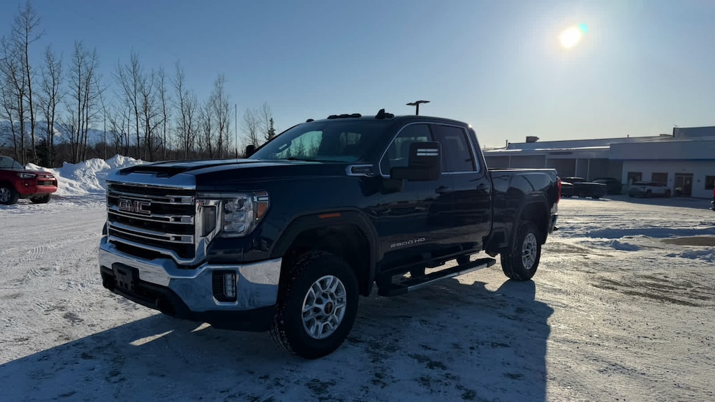 includes (CJ2) dual climate control, (A2X) 10-way power driver seat including power lumbar, (KA1) heated driver and passenger seats, (KI3) heated steering wheel, (N37) manual tilt/telescoping steering column, (C49) rear-window defogger, (ATH) Keyless Open and Start, (N06) Steering column lock, (BTV) Remote Start, (UTJ) content theft alarm, (AZ3) front 40/20/40 split-bench with underseat storage, (USS) 2 charge-only USB ports for second row, (UF2) cargo bed LED lighting, (KPA) rear auxiliary 12-volt power outlet, (T3U) fog lights, (U01) Roof Marker Lamps and (B1J) rear wheelhouse liners (Vehicles built prior to 11-15-2021 and on or after 2-21-2022 through 3-13-2022 and after 4-24-2022 will include heated driver and front outboard passenger seats. Certain vehicles built between 11-15-2021, (dealer-installed), includes (JHD) Hill Descent Control, (NZZ) skid plates, Off-Road suspension, Twin-tube Rancho shocks and X31 hard badge Includes (QXT) LT265/70R17E all-terrain, blackwall tires. AM/FM stereo with seek-and-scan and digital clock, includes Bluetooth® streaming audio for music and select phones; featuring wired Android Auto® and Apple CarPlay® capability for compatible phones (STD), with Direct Injection and Variable Valve Timing, gasoline, (401 hp [299 kW] @ 5200 rpm, 464 lb-ft of torque [629 N-m] @ 4000 rpm) (STD), (STD). GMC SLE with Pacific Blue Metallic exterior and Jet Black interior features a 8 Cylinder Engine with 401 HP at 5200 RPM*.