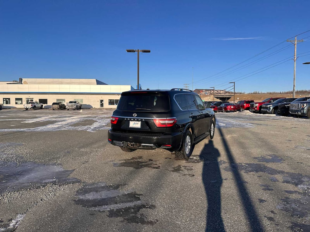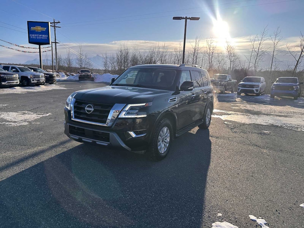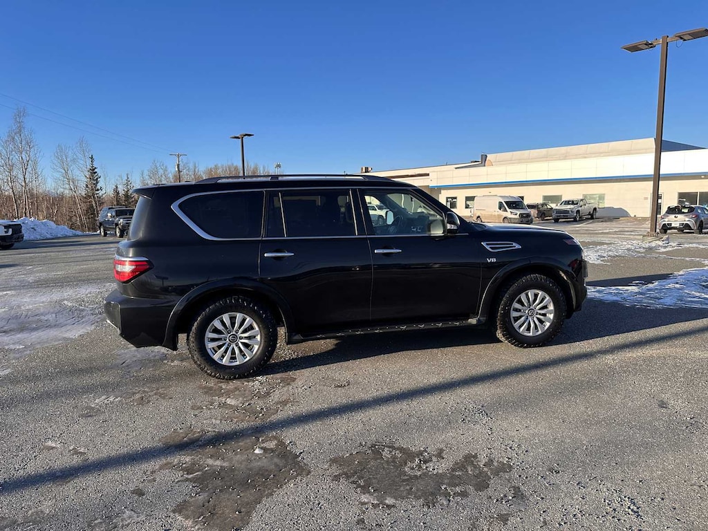 Third Row Seat, Navigation, 4x4, Rear Air, Heated Driver Seat, Back-Up Camera, Running Boards, Satellite Radio, iPod/MP3 Input, Onboard Communications System, Trailer Hitch, Aluminum Wheels, Keyless Start, Dual Zone A/C, Lane Keeping Assist Rear Spoiler, MP3 Player, Keyless Entry, Privacy Glass, Steering Wheel Controls. Nissan SV with Super Black exterior and Charcoal interior features a 8 Cylinder Engine with 400 HP at 5800 RPM*.